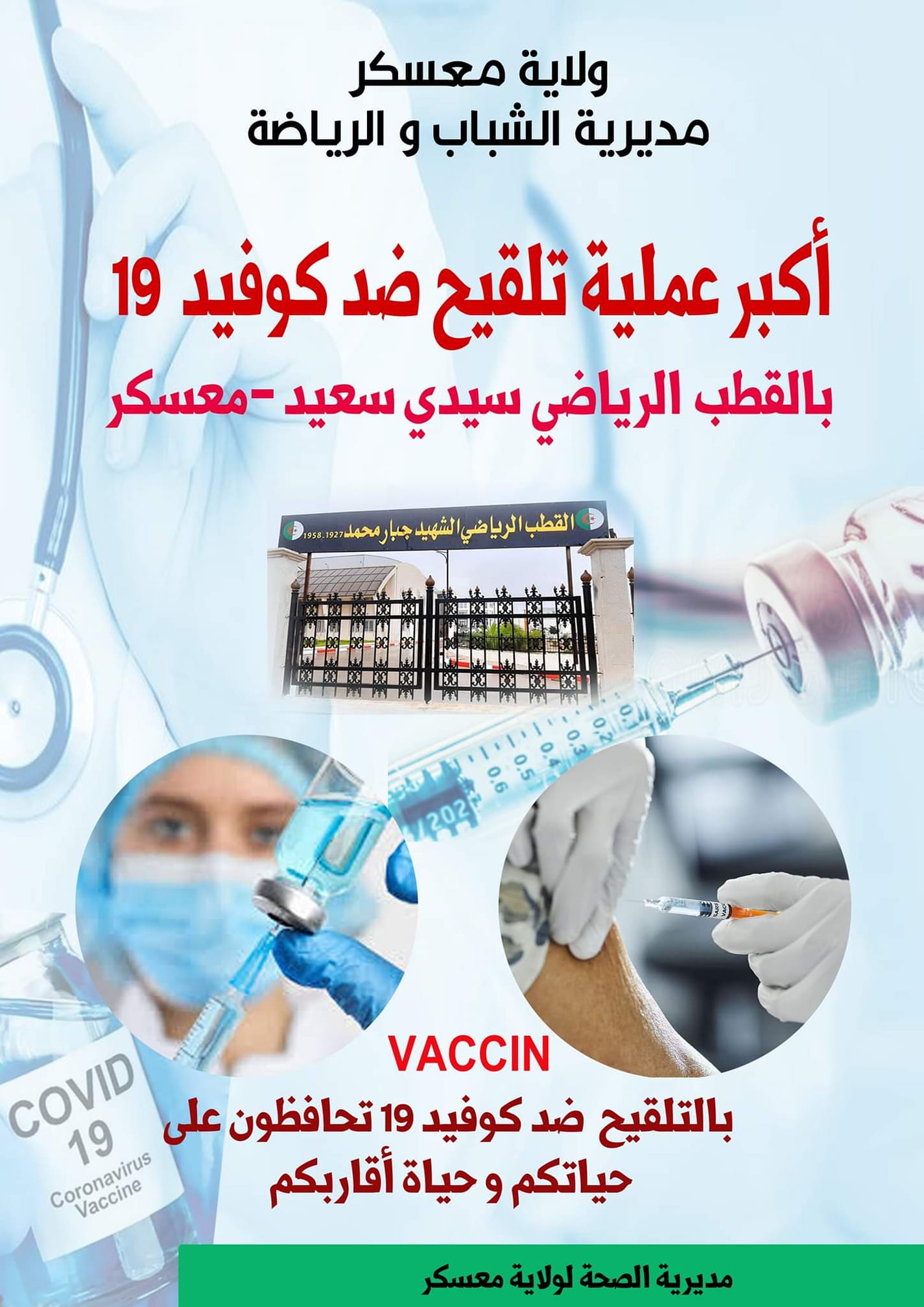 ينهي السيد  عبد الخالق صيودة والي ولاية معسكر إلى علم كافة مواطني و مواطنات بلدية معسكر عن تنظيم أكبر عملية تلقيح على مستوى القاعة متعددة الرياضات