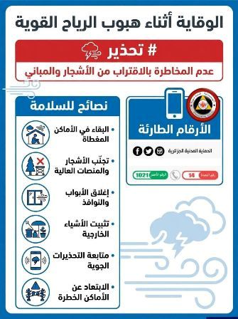يرجى من المواطنين توخي الحيطة والحذر، وتفادي التنقل غير الضروري خلال فترة صلاحية النشرية، مع الالتزام بتعليمات مصالح الحماية المدنية والسلطات المحلية حفاظًا على السلامة العامة.