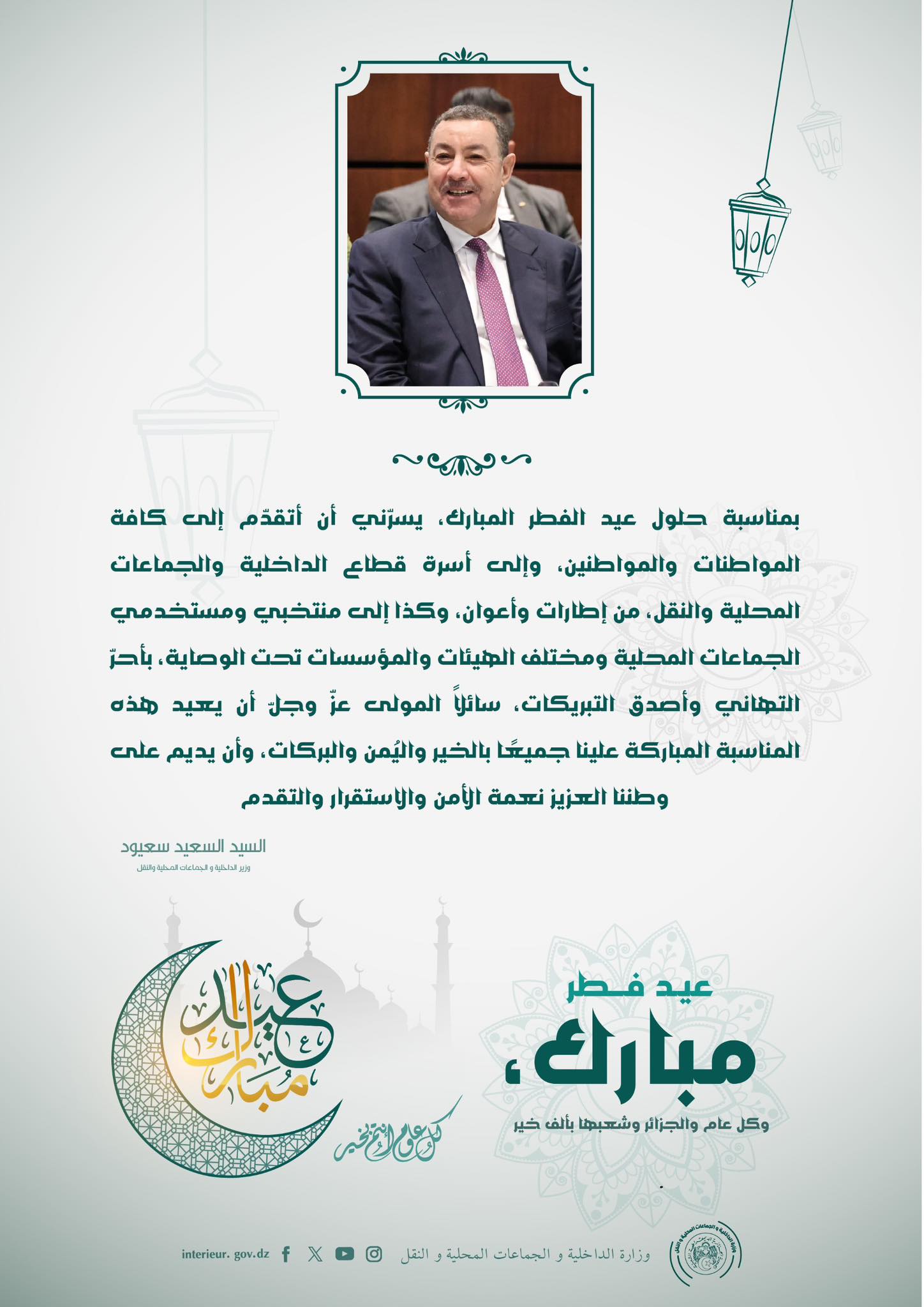 في أجواء ملؤها الخشوع والتقوى، أدى صبيحة اليوم السيد فؤاد_عايسي، والي ولاية معسكر، صلاة عيد الفطر المبارك بمسجد الفضيل الورثلاني بالكرط بحضور السيد رئيس المجلس الشعبي الولائي، أعضاء اللجنة الولائية، نواب البرلمان بغرفتيه، السلطات المحلية والمدنية، وإقبال واسع من المواطنين للمشاركة في شعائر الصلاة.