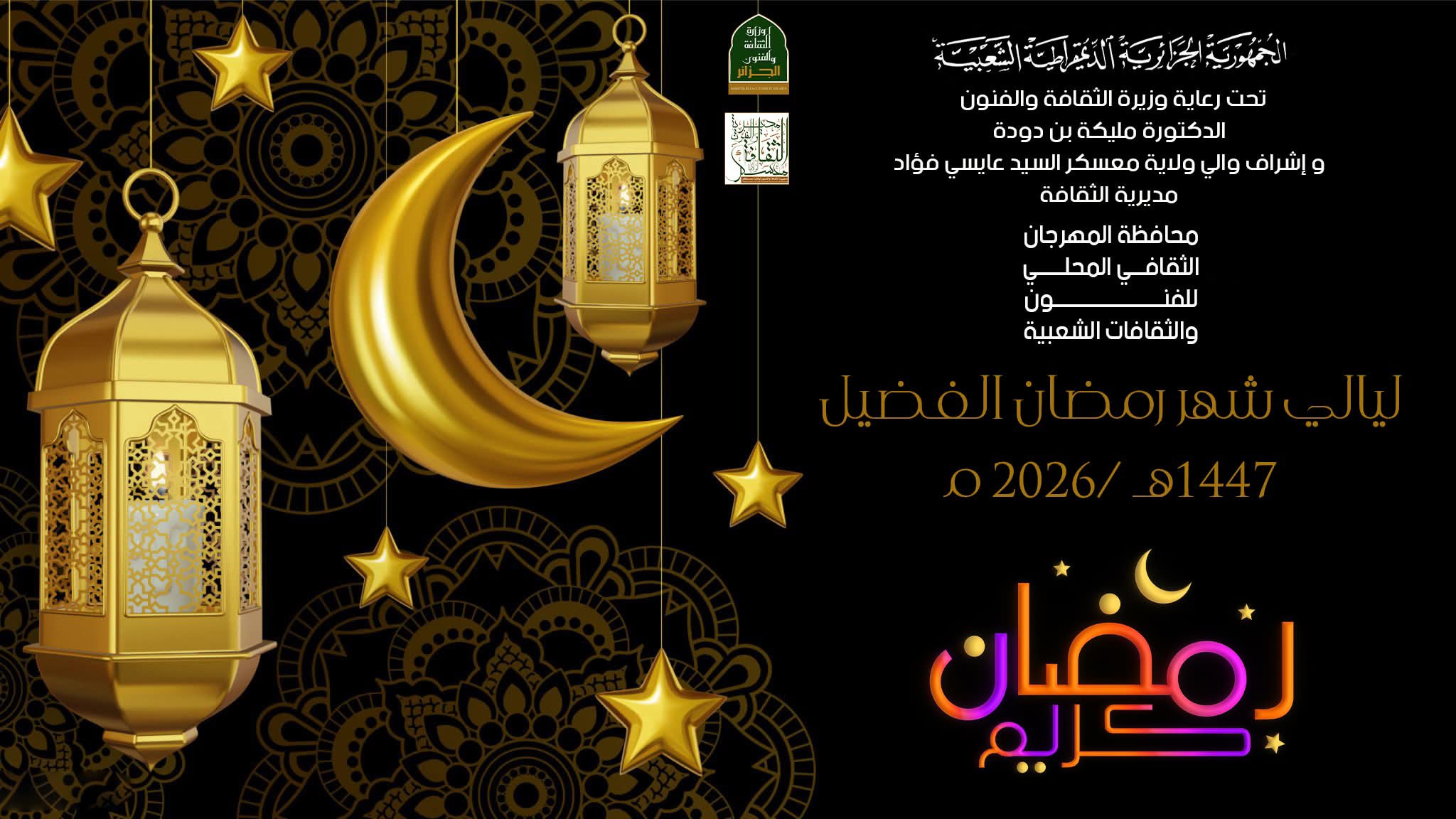 في أجواء إيمانية تعبق بنفحات الشهر الفضيل، وتحت إشراف السيد عايسي_فؤاد والي الولاية، تطلق مديرية الثقافة لولاية معسكر برنامجها الثقافي الخاص بشهر رمضان المبارك، ليكون موعدا متجددا مع الإبداع، والفن، والأصالة.يتضمن سهرات فنية، أمسيات أدبية، عروضا مسرحية وأنشطة موجهة للعائلات والأطفال.