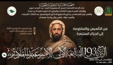 تحت الرعاية السامية لرئيس الجمهورية السيد عبد المجيد تبون، وبإشراف السيدة وزيرة الثقافة والفنون الدكتورة مليكة بن دودة، والسيد وزير المجاهدين وذوي الحقوق الدكتور البروفيسور عبد المالك تاشريفت ووالي ولاية معسكر السيد فؤاد عايسي.