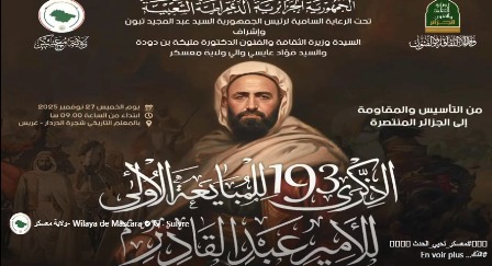 كما وقف السيد الوالي شخصيًا على التحضيرات الجارية لإحياء الذكرى 193 للمبايعة الأولى للأمير عبد القادر، مشددًا على ضرورة تسريع وتيرة التحضيرات والتنسيق بين مختلف المصالح من أجل إنجاح هذا الموعد التاريخي بما يليق بمكانة الأمير عبد القادر