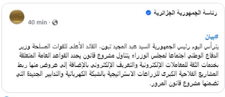 يترأس اليوم رئيس الجمهورية السيد عبد المجيد تبون، القائد الأعلى للقوات المسلحة وزير الدفاع الوطني اجتماعا لمجلس الوزراء يتناول مشروع قانون يحدد القواعد